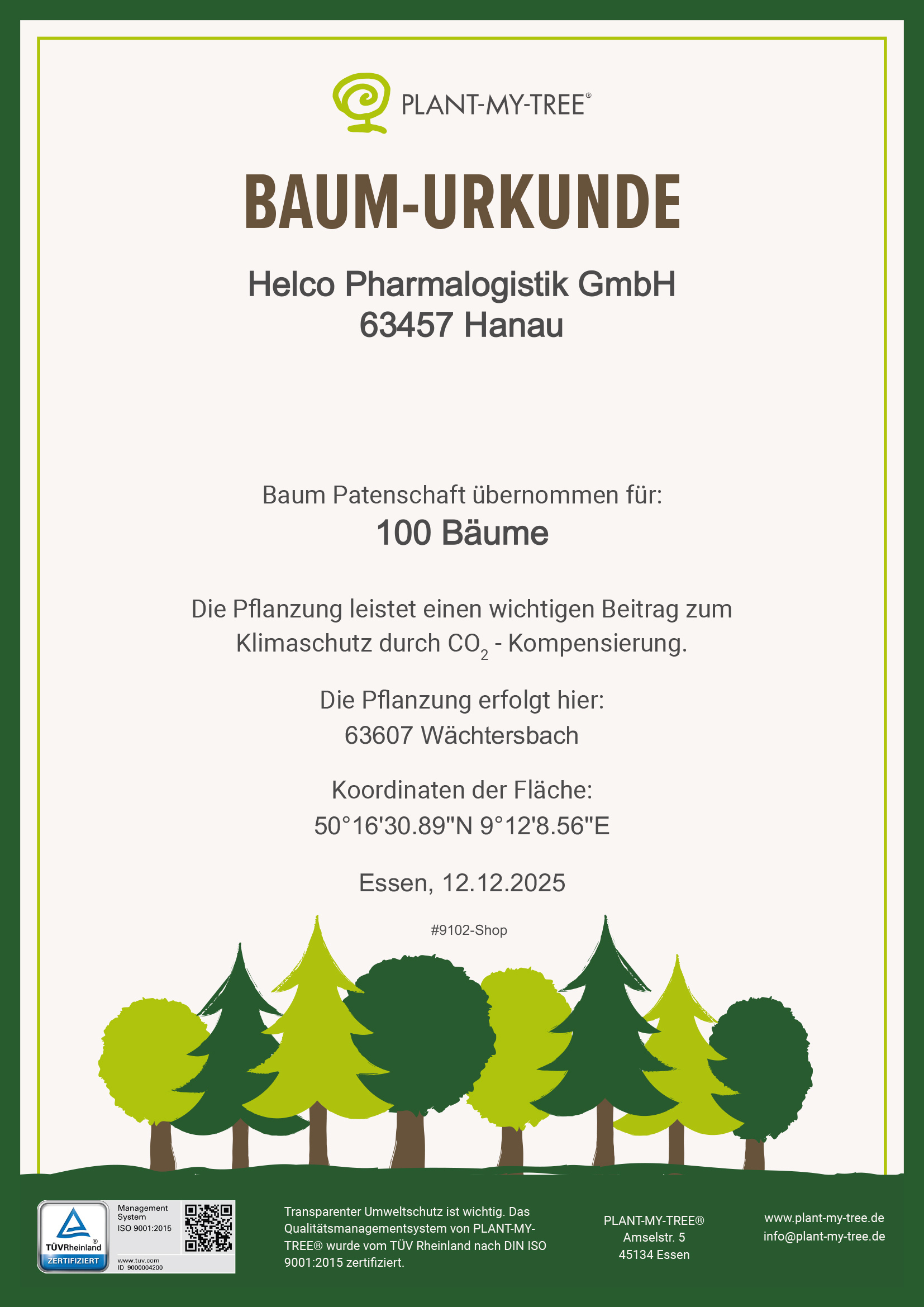 Die Pflanzung erfolgt in Wächtersbach (Main-Kinzig-Kreis, Hessen). Und weil Umweltschutz transparent sein sollte: Das Qualitätsmanagementsystem unseres Aufforstungspartners ist vom TÜV Rheinland nach DIN ISO 9001:2015 zertifiziert. Damit gelten definierte Qualitätsstandards für Planung, Pflanzung und Pflege.